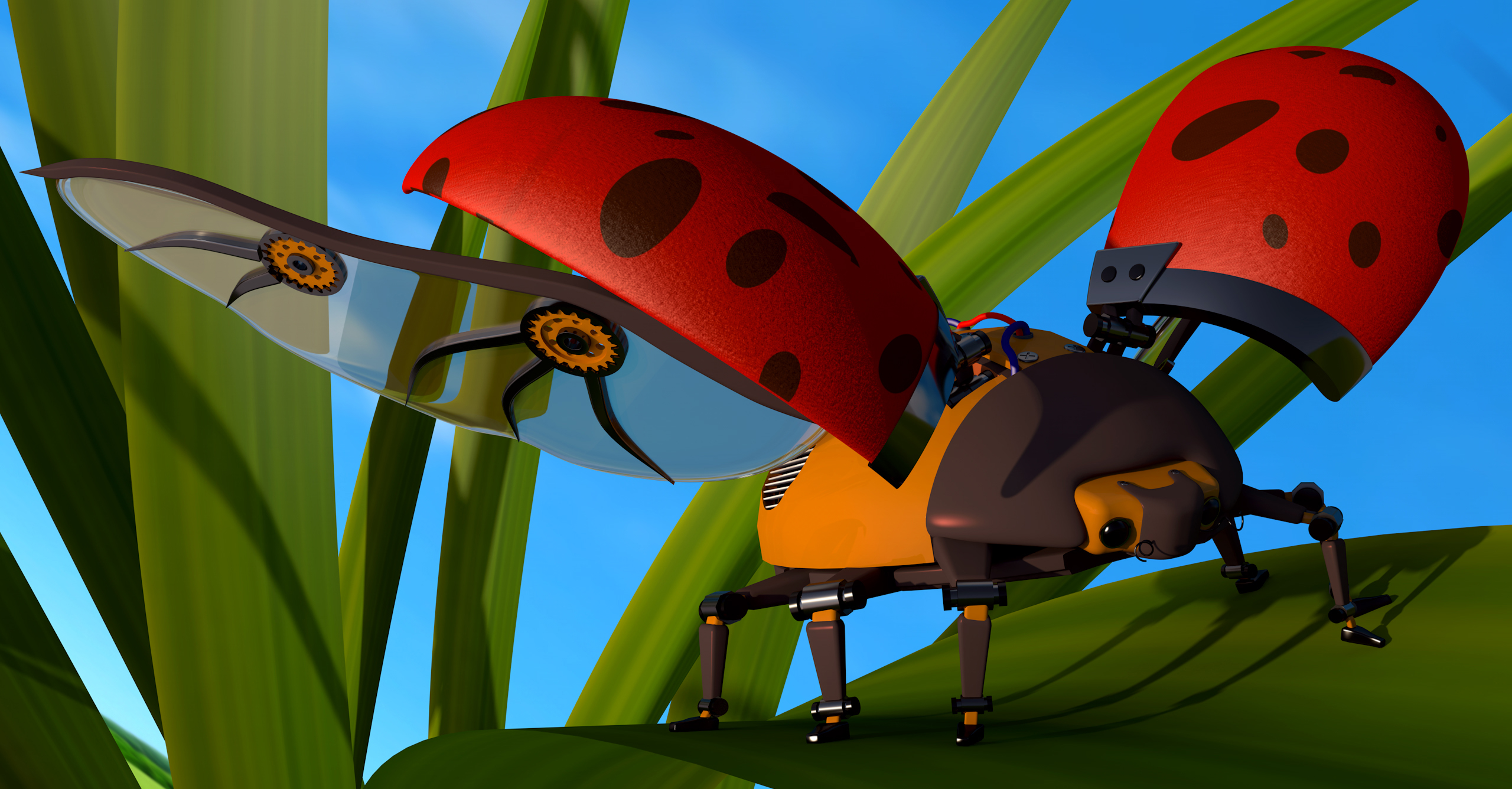The body of the ladybug can be compared to a computer, where all the wires, motherboards, and CPU’s are hidden inside the yellow plastic body. The wings are connected to the body using gear mechanisms, which rotate when the ladybug is flying. It also has gears inside the wings, which allows them to be folded when the ladybug is at rest. Fianlly, the elytras, which are organic are connected to the body using a clamping system.